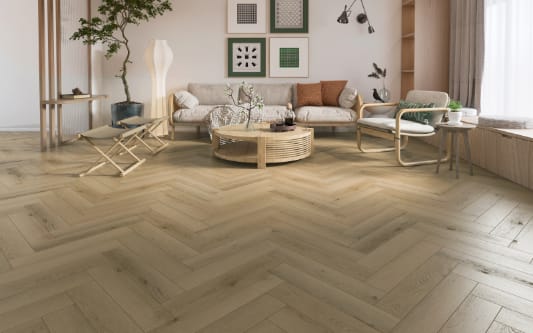 Sierra Beige combineert de warme sfeer van een zachte beige houttint met de statige uitstraling van visgraat. De Silent-constructie met geïntegreerde kurk zorgt voor 10 dB geluidsreductie en extra loopcomfort, wat deze vloer ideaal maakt voor drukke huishoudens en appartementen.