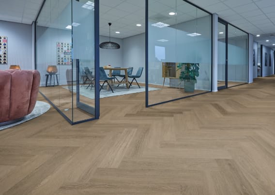 De extra brede en lange planken versterken het luxe karakter van deze vloer en laten ruimtes groter en rustiger ogen. De natuurgetrouwe EIR-structuur volgt het houtdessin tot in detail, terwijl de extra matte toplaag zorgt voor een realistische uitstraling en een prettig, comfortabel loopgevoel. De subtiele micro-bevel aan alle zijden benadrukt het visgraatmotief en geeft de vloer een hoogwaardige afwerking.