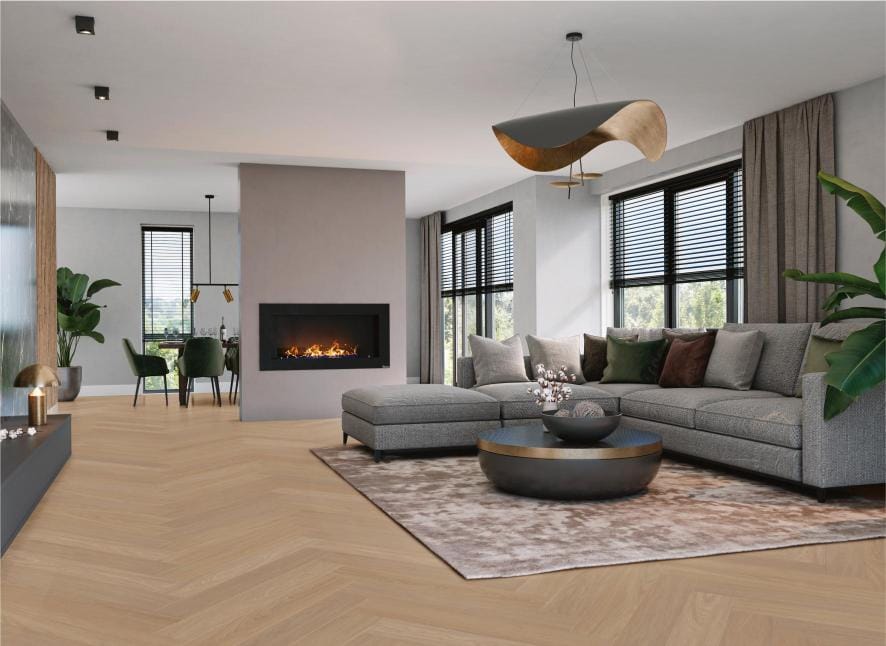 De 7870 is nu ook verkrijgbaar in een stijlvolle walvisgraatuitvoering, waarmee deze vloer een extra luxueuze en eigentijdse uitstraling krijgen. Dankzij het royale plankformaat van 91,4 x 15,2 cm ontstaat een opvallend en ruimtelijk effect dat elke ruimte visueel vergroot. De zorgvuldig afgestemde combinatie van lichte en donkere bruintinten zorgt voor een harmonieuze balans en geeft de serie een uniek en warm karakter. De walvisgraatvloeren zijn verkrijgbaar in een lijmvariant, wat bijdraagt aan een stabiele en hoogwaardige vloerafwerking.